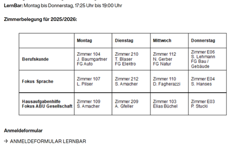 LernBar Untertstützung im Bereich ABU, BKU, und DAZ (Deutsch als Zweitschprache) Diese findet jeweils am Montag - Donnerstag von 17.25 -19:00 Uhr statt.